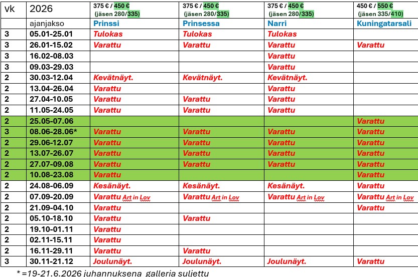 | Kuningatarsali | 450 € (jäsenhinta: 335 €) | 550 € (jäsenhinta: 410 €) | 450 € (jäsenhinta: 335 €) |