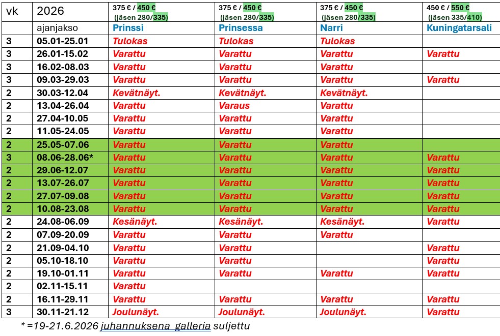 Huomioithan! Näyttelyvaraus on sitova. Kesäkuukausina (25.5.–23.8.) vuokrat ovat hieman korkeampia. Hintojen erot näkyvät vihreällä merkittyinä varauskalenterissa.